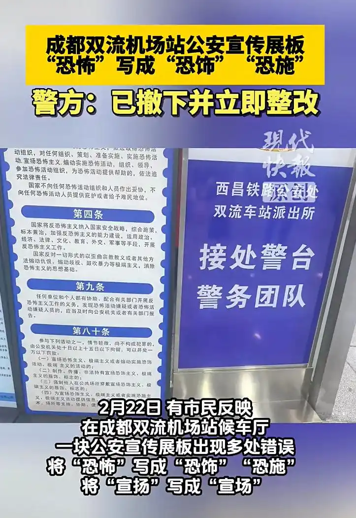 成都一高铁站公安展板现多个错字,警方回应:撤下并整改