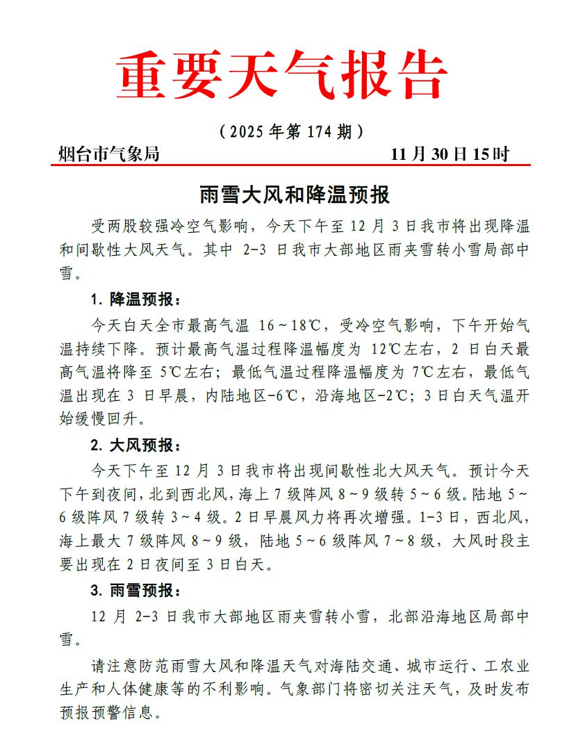 最低温-6℃!12月2—3日烟台大部地区雨夹雪转小雪局部中雪