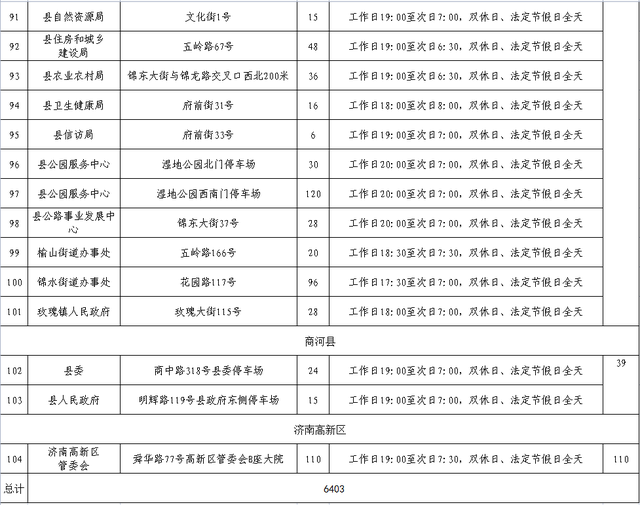 据了解,从10月1日起开放的首批停车场,主要包括龙奥大厦内部部分停车场和外部附属停车场、各区县党委政府及济南高新区管委会办公场所内部停车场等,共104个停车场6403个泊位。年底前,统一发布第二批停车场所名单,实现应放尽放。