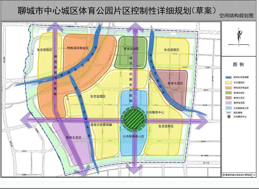 规划确立“一心三轴三廊网格化发展、九区连片均衡式布局”的总体布局结构。1、“一心”公共服务中心;2、“三轴”柳园路城市发展轴、城市公共服务发展轴、松桂大街景观轴;3、“三廊”徒骇河滨河生态景观廊、班滑河滨河生态景观廊、聊位河滨河生态景观廊;4、“九区”特色滨河商业区、公共服务核心区、教育示范区、体育运动区、医养生态区、4个生态宜居区。