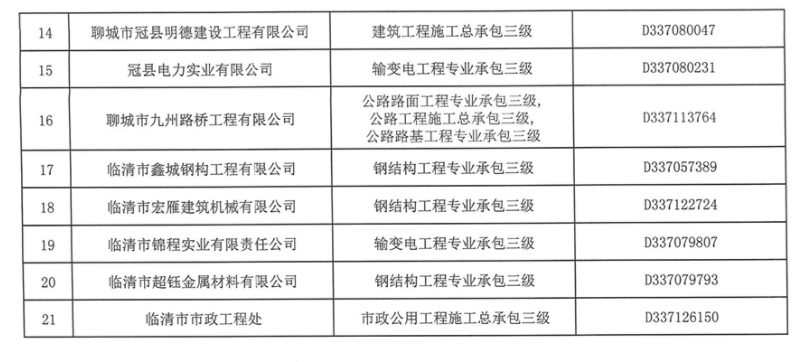 齐鲁晚报·齐鲁壹点 聊城市住建局发布公告,21家建筑企业因不符合建筑资质标准,建议行政审批部门撤回企业资质。 据了解,山东佳美建筑装饰工程有限公司、聊城兴泰建安有限公司等21家建筑业企业主要人员不满足建筑资质标准,责令限期整改后,上述企业仍不符合建筑资质标准。聊城市住建局拟建议行政审批部门撤回山东佳美建筑装饰工程有限公司、聊城兴泰建安有限公司等21家建筑业企业资质。
