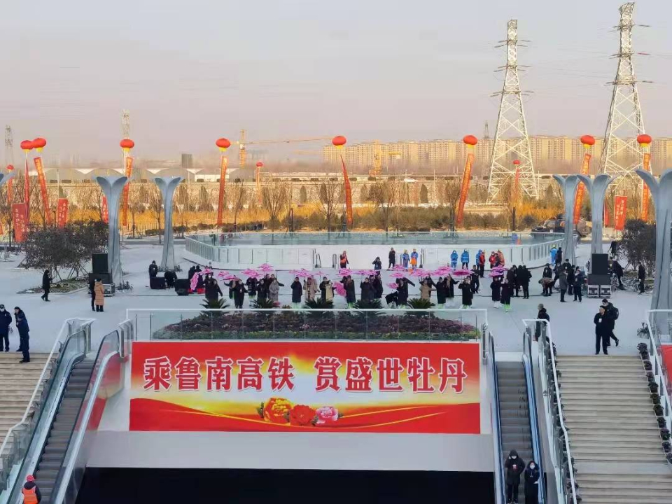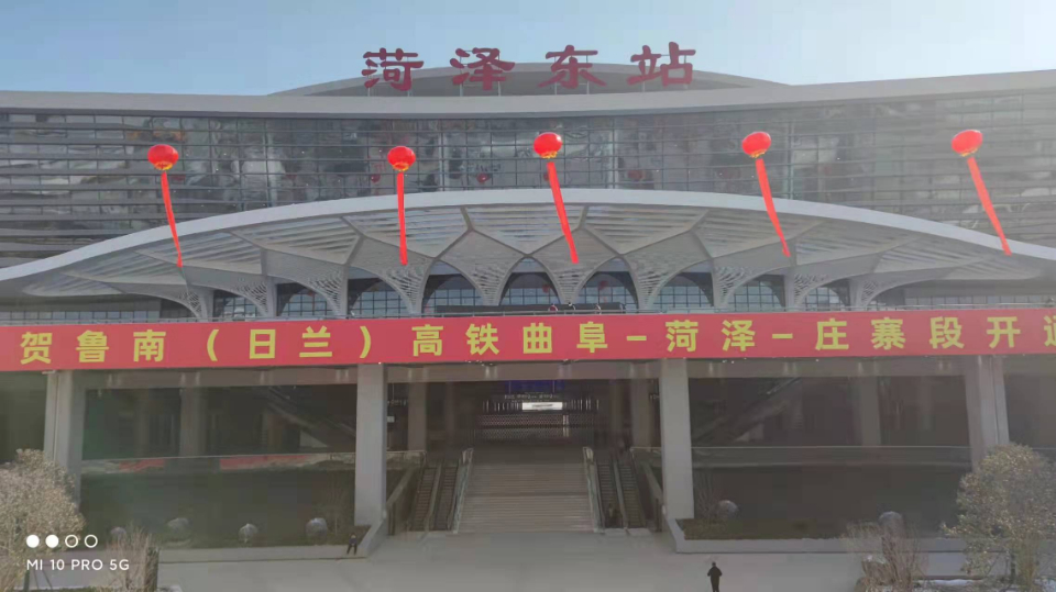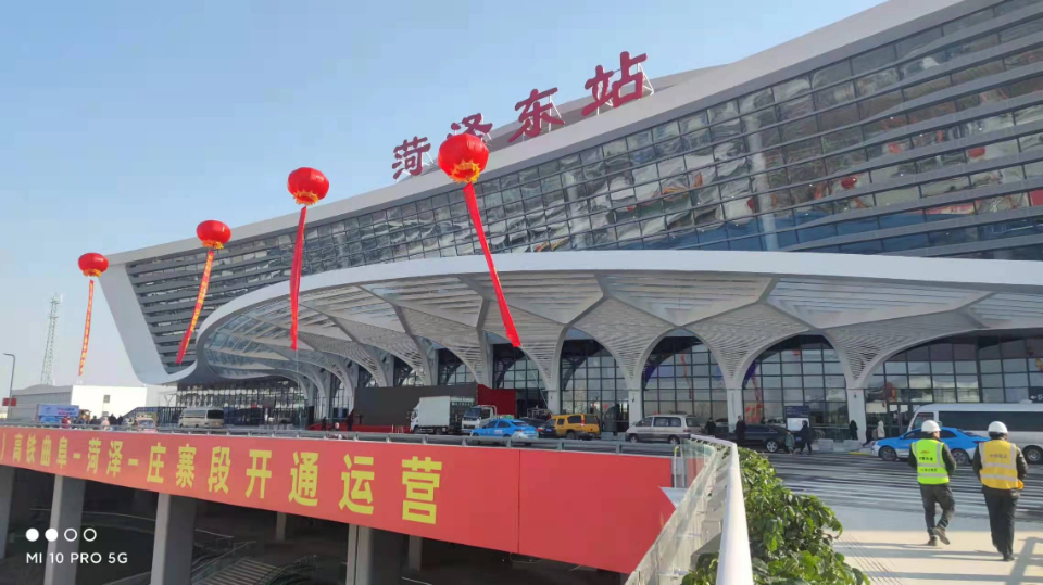 由中铁建设集团承建的国内首个以柔性屋面为主的铁路站房工程、鲁西南最大高铁站房——菏泽东站是鲁南高铁和京九高铁的交会点,总建筑面积19万余平方米,站房面积6万平方米,车场规模为6台15线,为线上式高架站房。