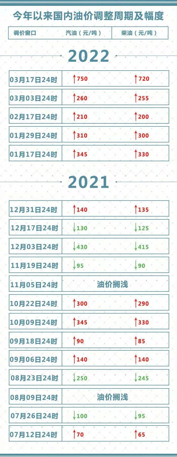本次油价调整,国内汽、柴油价格每吨分别提高750元和720元。