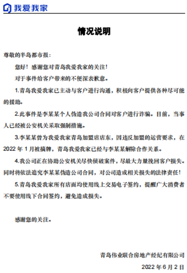 今天中午,记者联系到我爱我家青岛区域公司品质部一名姓郝的负责人,其出示了一份情况说明,其中提到:上述事件是我爱我家7080中心广场店李姓负责人个人伪造我爱我家合同对客户进行的诈骗,目前当事人已被公安机关采取强制措施。并称“李曾为我爱我家青岛加盟店店东,因违反加盟的运营要求,在2022年1月被摘牌,青岛我爱我家已与李解除合作关系。”