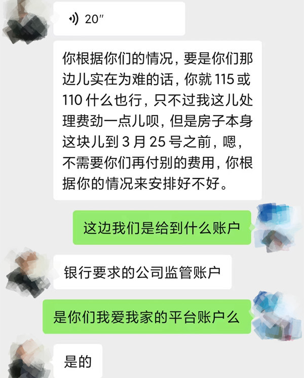 史女士和丈夫都是95后,毕业后想留青生活,便想买套房子落脚。今年2月,他们从网上看到一套心仪的房源,便联系上了我爱我家7080中心广场店的李姓负责人。这套房子位于市北区南京路上,总价275万元。几天后,史女士按约定交了10万定金,并将155万元首付款分三次转给了中介。“当时这名李姓负责人跟我信誓旦旦地说,我们的首付款是打进银行要求的监管账户,也是我爱我家的平台账户。我们根本没做任何怀疑,就把钱转进了一个名为‘青岛悦家伟业房产经纪咨询有限公司’的农业银行的户头。”史女士说。