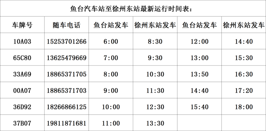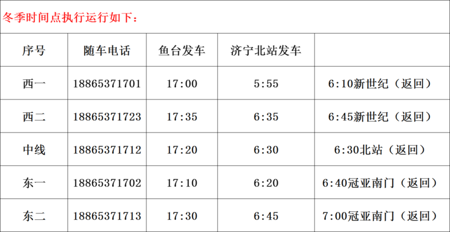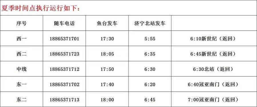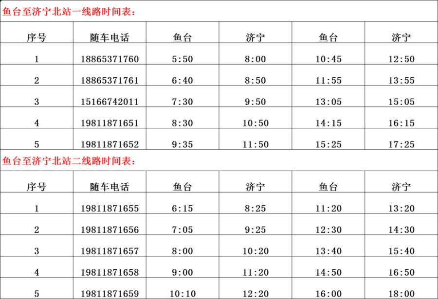 鱼台汽车站线路班车最新时刻表: