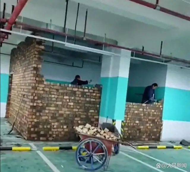 现场视频显示,在地下车库一处拐角两个相连的车位,有工人正在施工,砌墙一砖到顶,另一面墙上留有进出的一扇门。此处车库顶部还挂有“停放有序 出入快捷”的提示牌。