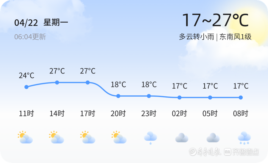 4月22日,农历三月十四,聊城今日天气多云转小雨,东南风1级,空气质量等级为良,PM2.5值为98微克/立方米。市民出行请注意携带雨具,同时关注天气变化,适时增减衣物,以防感冒。