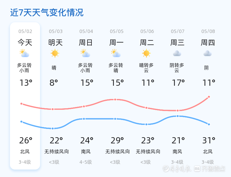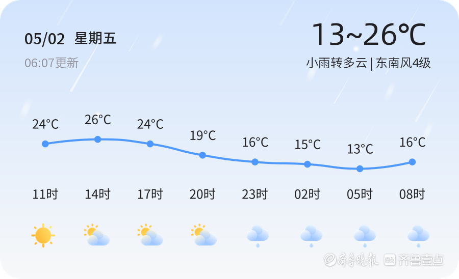 今天是2025年5月2日,农历四月初五,星期五。聊城市的天气为小雨转多云,当前时间为早上607,温度为19.7℃,空气质量良好,PM2.5为56。今天全市各区均经历了小雨天气,随后逐渐转为多云,东南风4级,空气湿度为44%。市民出行时请注意携带雨具,留意天气变化。