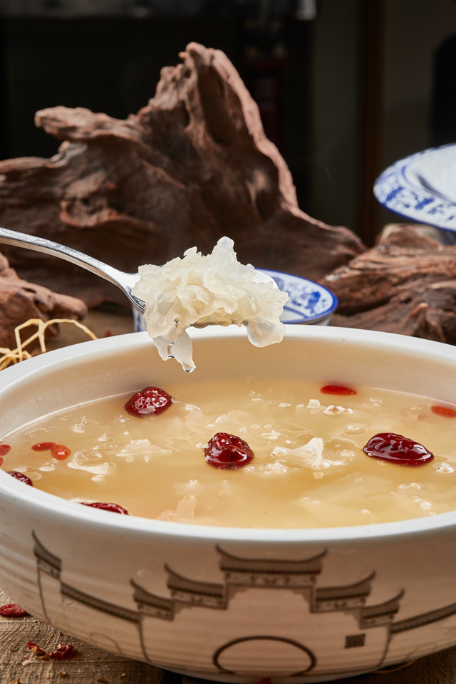等银耳熬得黏稠出了胶质,加几枚红枣接着炖,最后撒把枸杞,用玻璃汤盅盛了,琥珀色的汤里便浮着秋云一样的白、晚霞一样的红、秋叶一样的黄,稠稠的、亮亮的,喝到嘴里满是甜糯顺滑。