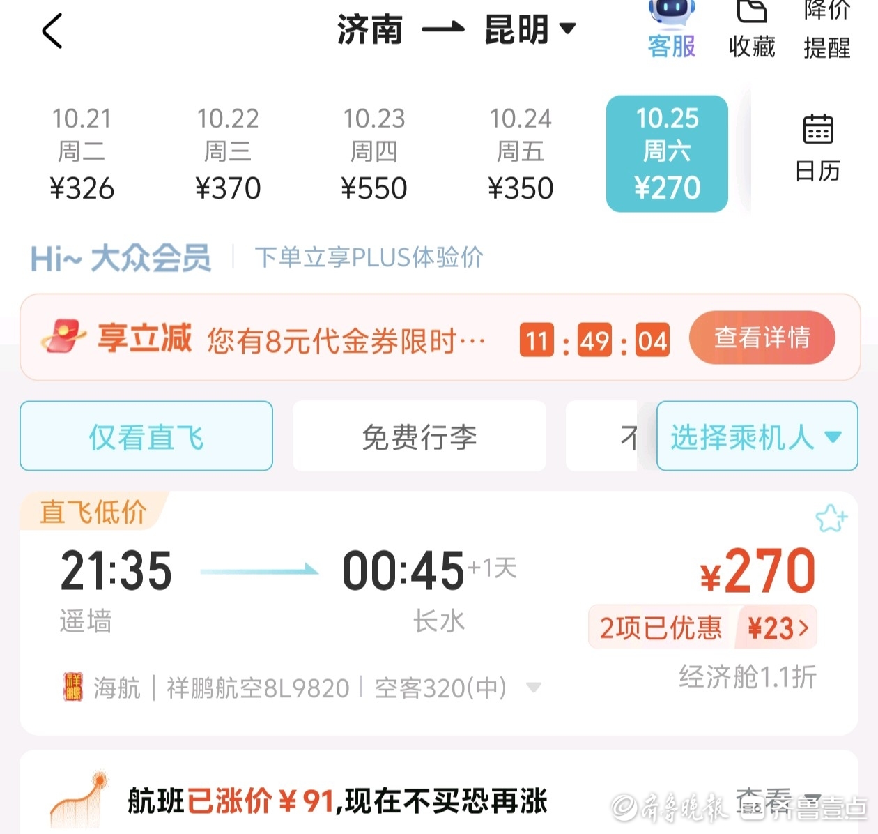 记者在去哪儿平台上看到,10月21日从济南飞往昆明的直飞航班最低价仅326元(不含机建燃油费),10月25日更是低至270元(不含机建燃油费)。