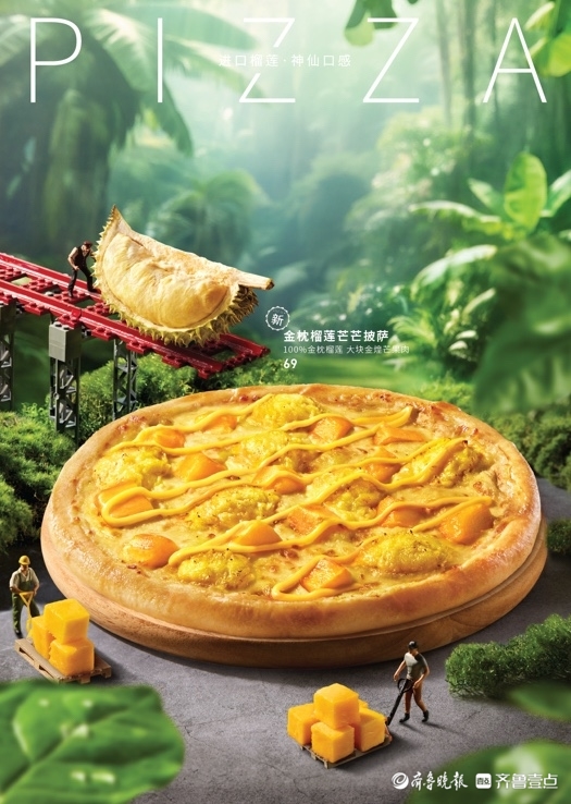 有时,我还会遇上来自热带的伙伴——大块的芒果肉。我们一拍即合,共同化身成为【金枕榴莲芒芒比萨】呈现在你面前,用双重热带风情,征服无数味蕾。