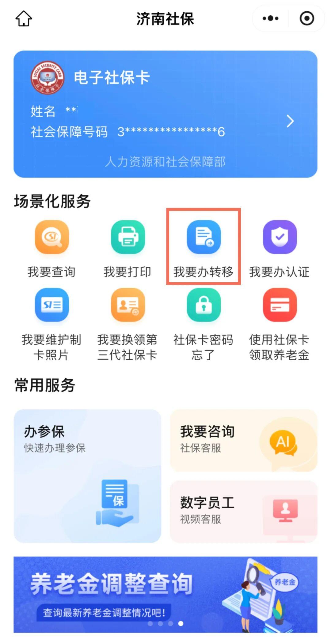 养老保险跨省转移接续可线上办理。参保人在济南市参保后,通过“济南社保”微信公众号点击“办社保”,在办事页面中选择“我要办转移”,办理养老保险的跨省转移业务。