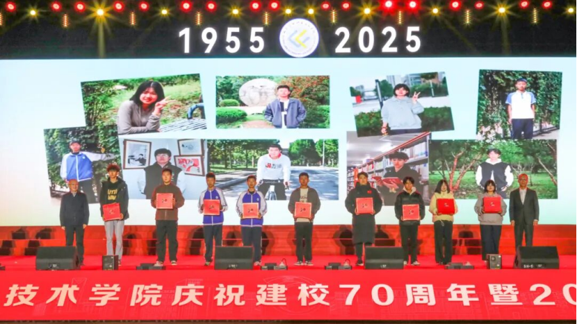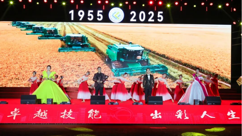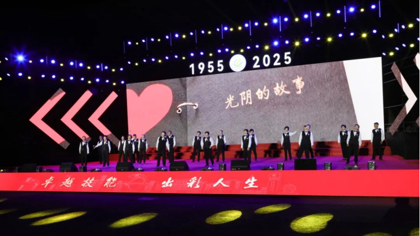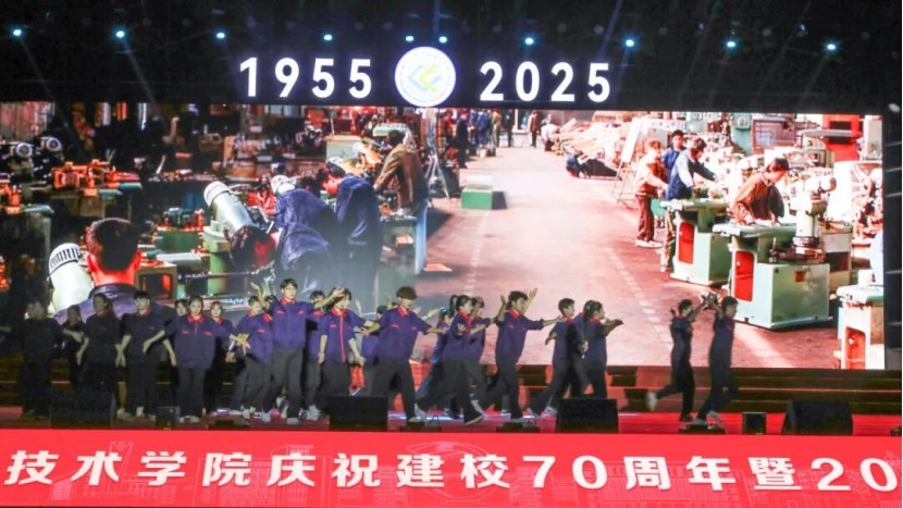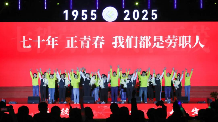 晚会尾声,全体主持人与演员共同唱响《再一次出发》《走向现代化的明天》,在激昂的旋律中,全场师生共同回顾学院70年从“简陋厂房”到“现代化校园”、从“传统技能教学”到“智能职教标杆”的跨越。