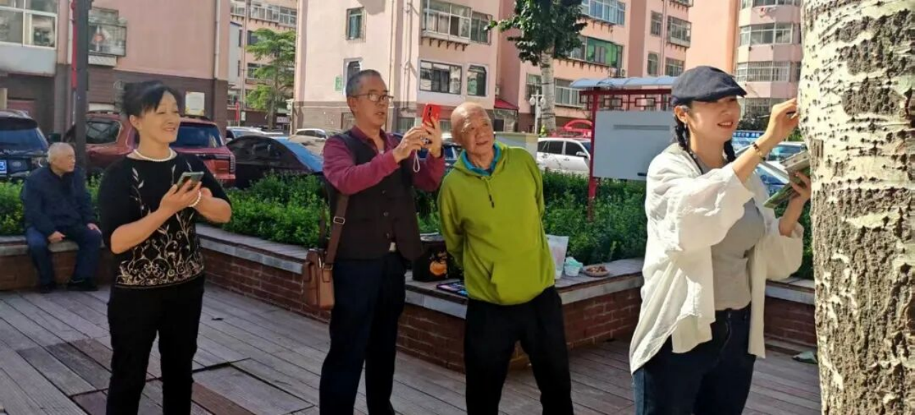 等大家收工,原本只当“背景板”的绿树彻底变了样:树干上飘着白云,飞鸟好像要从树里飞出来,连之前虫蛀的小洞,都被画成了小松鼠的“粮仓”。当天下午,这些树就成了社区“网红打卡点”,居民们纷纷拍照留念,并发朋友圈分享这份独特的社区美景。