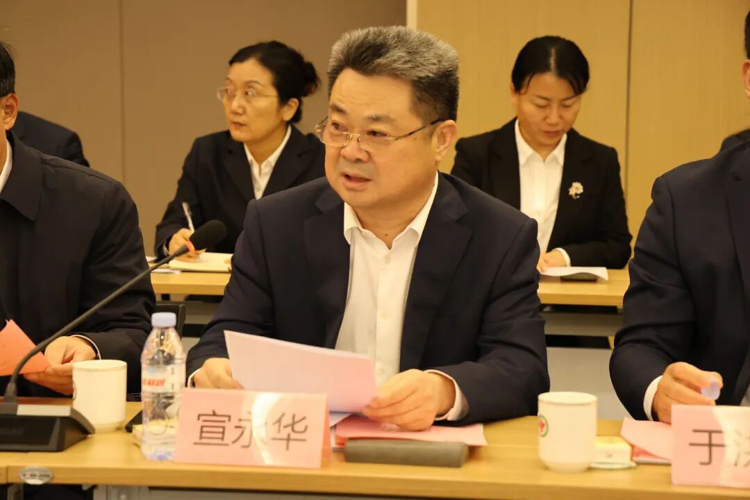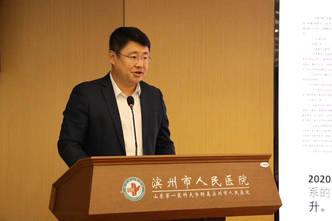 党委委员、副院长于洪建作教学工作汇报,详细介绍了医院自2019年成为山东第一医科大学附属医院以来,在教学建设、师资培养和设施投入等方面取得的进展。