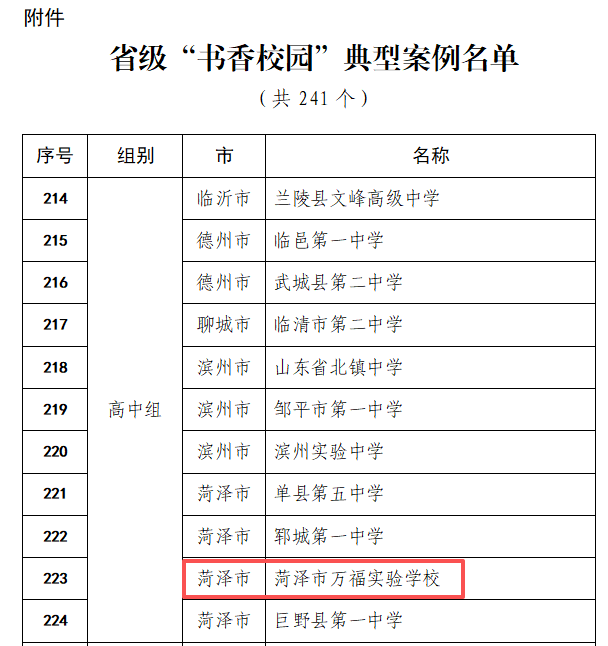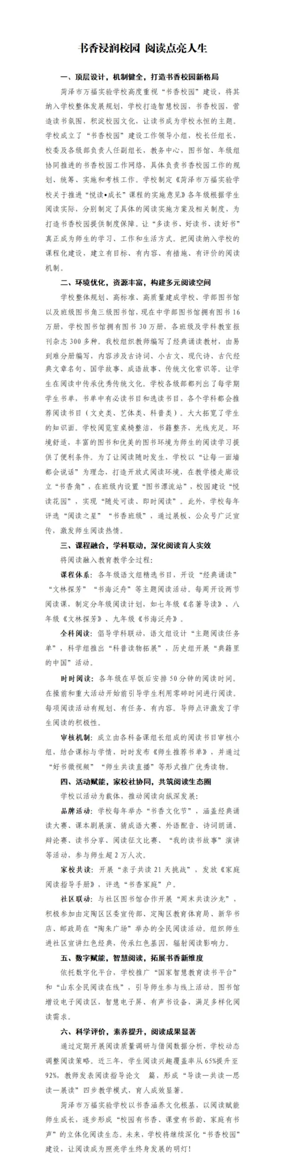 近日,山东省教育厅公布了2025年省级“书香校园”典型案例名单,菏泽市万福实验学校成功入选,成为菏泽市定陶区高中段唯一获此殊荣的学校!