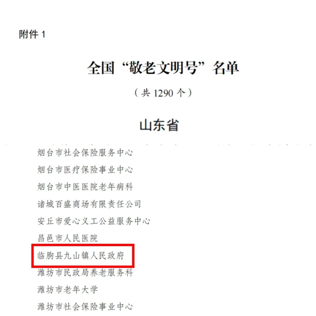 为表彰先进、树立榜样,进一步激励和动员全社会重视、支持和参与为老服务,营造敬老爱老助老社会氛围,根据全国老龄工作委员会办公室《关于开展2025年全国敬老爱老助老活动评选工作的通知》,临朐县九山镇人民政府被授予全国“敬老文明号”称号。
