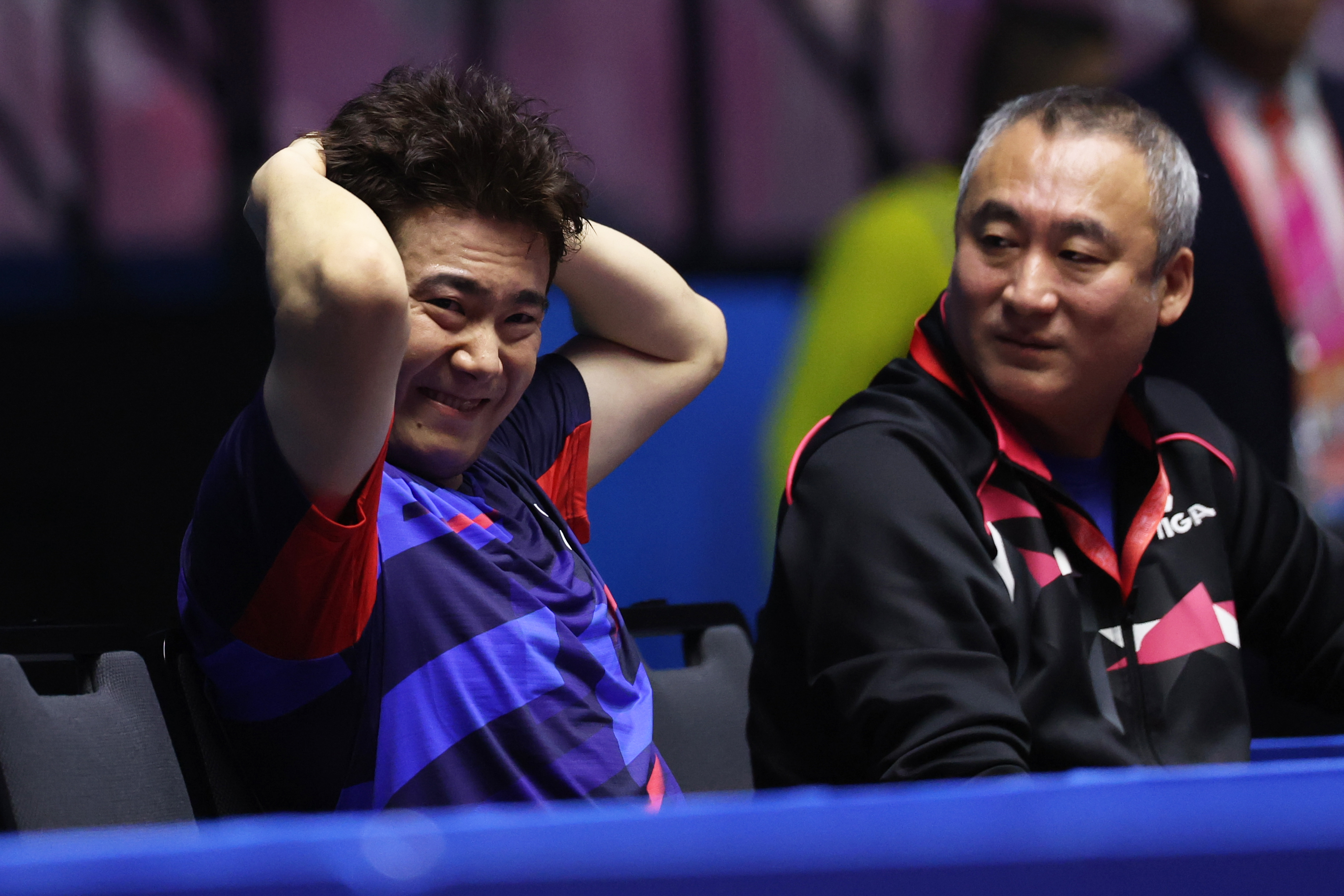 11月11日,河北队选手梁靖崑(左)在休息时与教练交流。新华社