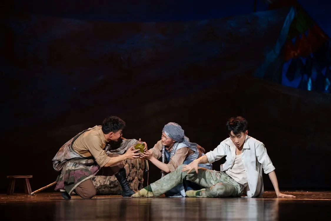 音乐创作上,该剧更是巧夺天工:悠扬婉转的草原民歌与富有时代印记的激昂旋律交相辉映,民族乐器的独特韵味与现代配乐的恢弘气势完美融合,将草原儿女的柔情与热血、科研工作者的坚韧与坚守渲染得淋漓尽致,为剧情推进注入了强劲的情感张力。舞台设计则采用纪实文学风格与纪录片艺术形式相结合的手法,活动围墙的灵活运用、虚实交织的场景转换,搭配细腻灵动的灯光舞美,既生动再现了金银滩草原“天苍苍、野茫茫”的辽阔壮美,又真实还原了科研基地从荒芜到崛起的建设图景。其中“电影院寻人”一幕尤为戳心:罗丁与索朗在熙攘人群中遥遥相望,却被流动的人潮与阻隔的围墙生生分离,简单的舞蹈动作背后,是特殊年代里普通人的遗憾与坚守,是个人命运与国家命运的深刻交织,让现场观众无不动容。