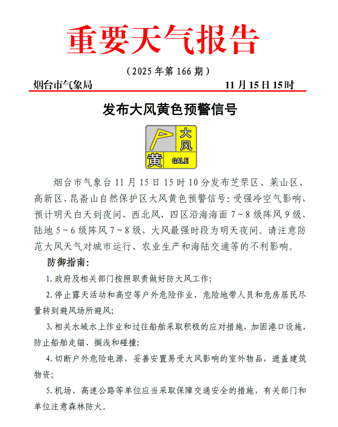 从烟台市气象台获悉,11月15日15时10分,市气象台发布芝罘区、莱山区、高新区、昆嵛山自然保护区大风黄色预警信号:受强冷空气影响,预计16日白天到夜间,西北风,四区沿海海面7~8级阵风9级,陆地5~6级阵风7~8级,大风最强时段为16日夜间。请注意防范大风天气对城市运行、农业生产和海陆交通等的不利影响。