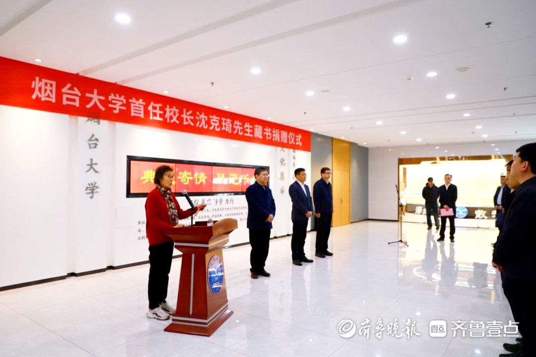 毕生典藏情寄烟大,风范千秋光耀黄海。11月15日上午,烟台大学首任校长,原北京大学副校长、校务委员会副主任沈克琦先生藏书捐赠仪式在逸夫图书馆深情举行。沈克琦校长女儿、北京大学图书馆研究馆员沈正华,烟台大学党委书记卢国强,副校长王洪波,党委常委、宣传部部长、教师工作部部长杨众晖出席仪式,同日参加“北大、清华两校教师进烟园”活动的北京大学35位教师以及烟台大学相关职能部门负责人、师生代表共同见证了这一充满温情和意义的时刻。