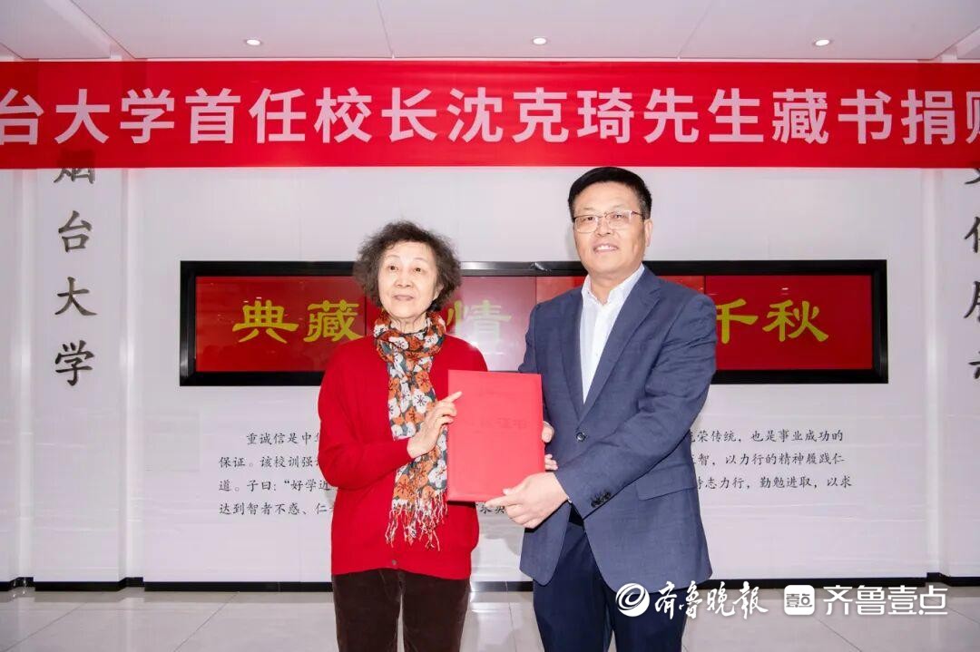 仪式上,沈正华将寄托着父亲对物理学毕生热爱和对烟台大学深深眷恋的藏书交到卢国强手中,卢国强代表烟台大学全体师生、校友,将承载着全体烟大人对老校长沈克琦先生永远的铭记与崇敬,以及对沈正华女士无私捐赠致以衷心感谢的证书交到沈正华手中,现场爆发出热烈的掌声,参加仪式的各位师生眼眶湿润、泛起泪花。