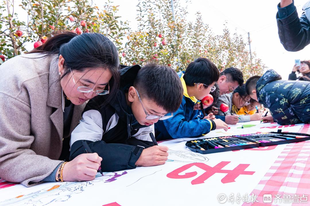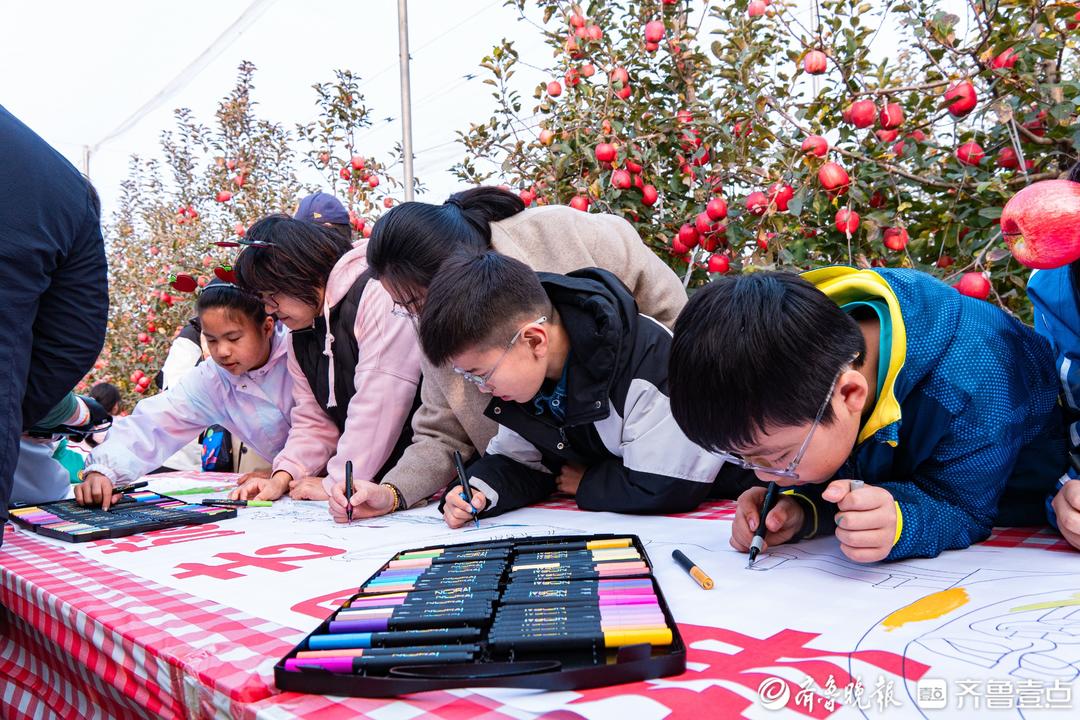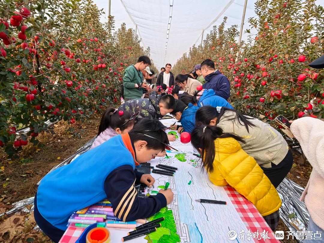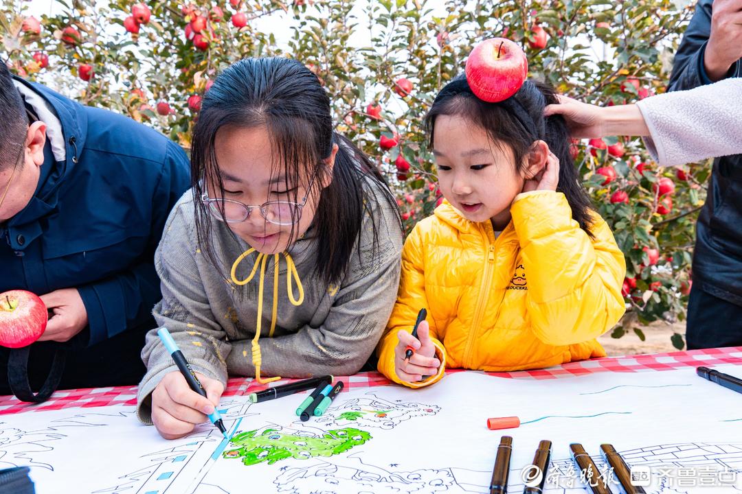 品尝完美味,创造力时刻到来!在挂满红彤彤果实的苹果树下,长长的画布铺开,上面勾勒着苹果元素和烟台山、蓬莱阁等著名地标的轮廓。孩子们拿起五彩画笔,化身“小画家”,在果园这个天然的画室里尽情挥洒创意。他们或蹲或坐,神情专注,为苹果涂上自己心中最美的颜色,为家乡的地标添上想象的翅膀。
