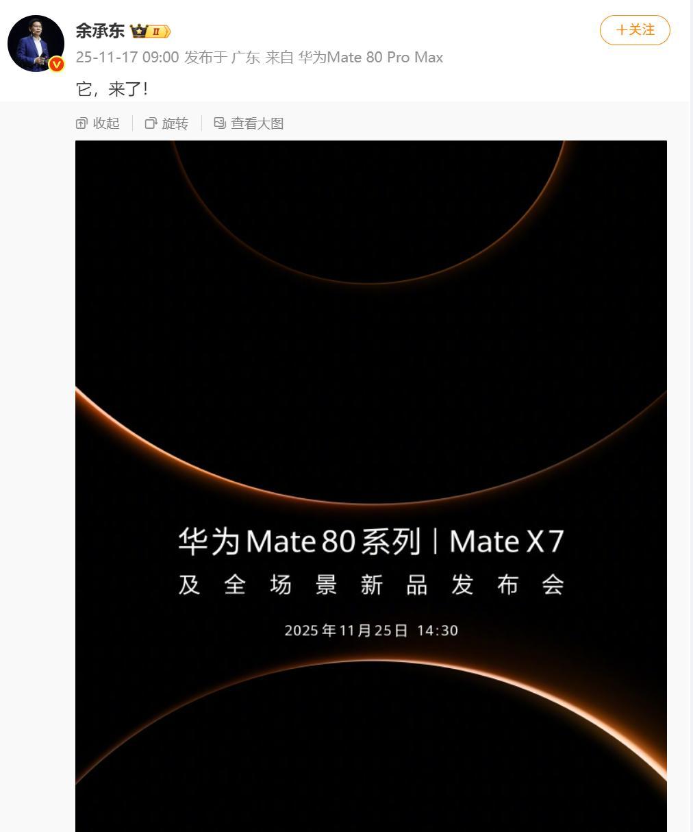 11月17日,华为常务董事、产品投资委员会主任、终端BG董事长余承东在微博发布海报显示,华为Mate 80系列 l Mate X7及全场景新品发布会将于11月25日14:30举行。