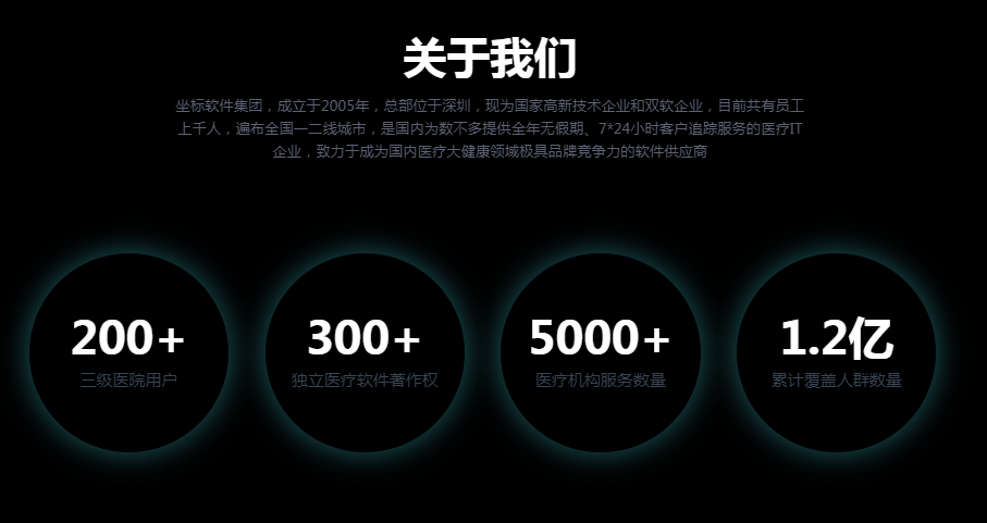 其母公司——坐标软件官网介绍,公司是国家级高新技术企业、中国医院信息化建设领导品牌,致力于推动医疗产业信息化、数字化、智慧化变革,并围绕医疗信息化领域构筑起覆盖全院、患者全生命周期的整体解决方案。截至2024年,公司在深圳、西安、郑州、洛阳设有四大研发中心,在国内设有30个分子公司服务网点,是国内为数不多提供全年无假期、7*24小时客户追踪服务的医疗IT企业,致力于成为国内医疗大健康领域极具品牌竞争力的软件解决方案供应商。