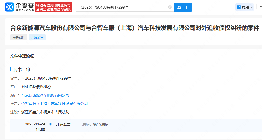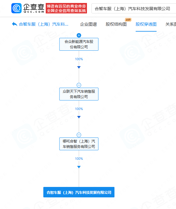 企查查APP显示,近日,法院刊登哪吒汽车即合众新能源汽车股份有限公司起诉合智车服(上海)汽车科技发展有限公司案件开庭公告,案由涉及对外追收债权纠纷,预计开庭时间为11月24日。企查查股权穿透显示,合智车服(上海)汽车科技公司由合众新能源汽车股份有限公司间接全资持股。 (企查查)