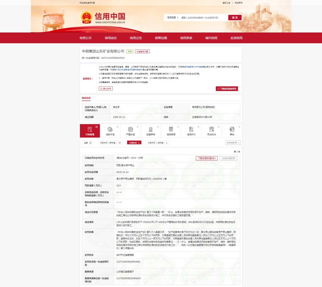 齐鲁晚报·齐鲁壹点记者于信用中国行政处罚信息栏获悉,11月14日,中钢集团山东矿业有限公司(下称“中钢山东矿业”)收到罚单,其处罚类别是“罚款;责令停产停业”,处罚机关为临沂市应急管理局。