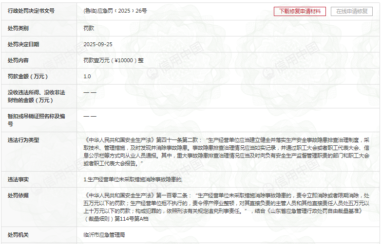 齐鲁晚报·齐鲁壹点记者注意到,9月25日,该公司亦曾因生产经营单位未采取措施消除事故隐患的违法事实,被罚款壹万元(¥10000)整。行政处罚决定书文号:(鲁临)应急罚﹝2025﹞26号。