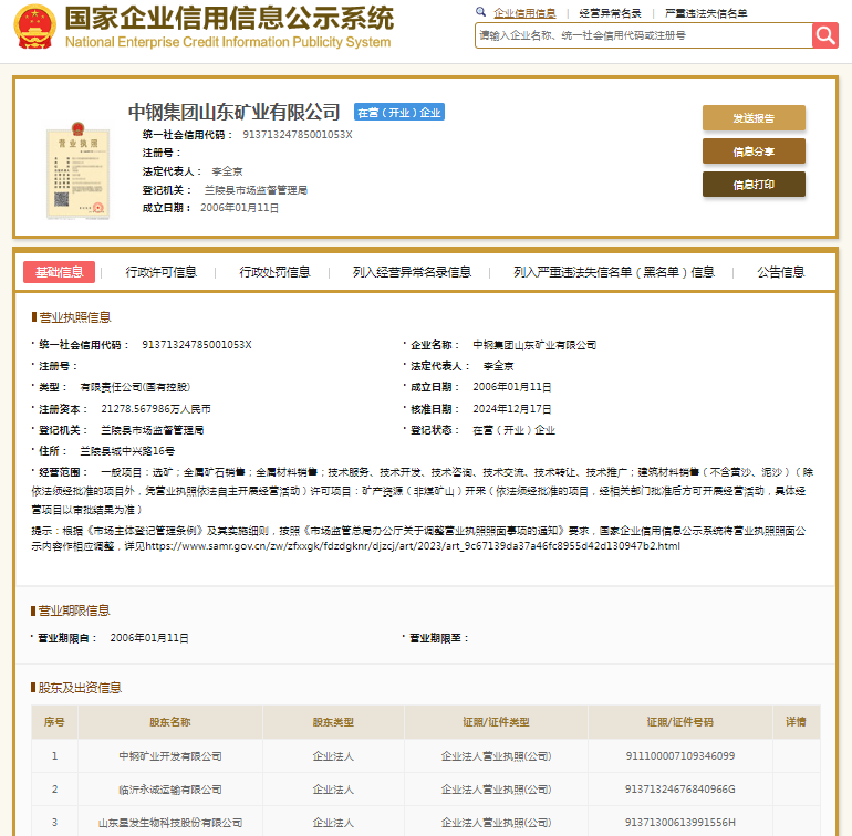 国家企业信用信息公示系统显示,中钢集团山东矿业有限公司成立于2006年,注册资本21278.567986万元人民币,法定代表人为李全京,大股东为中钢矿业开发有限公司。