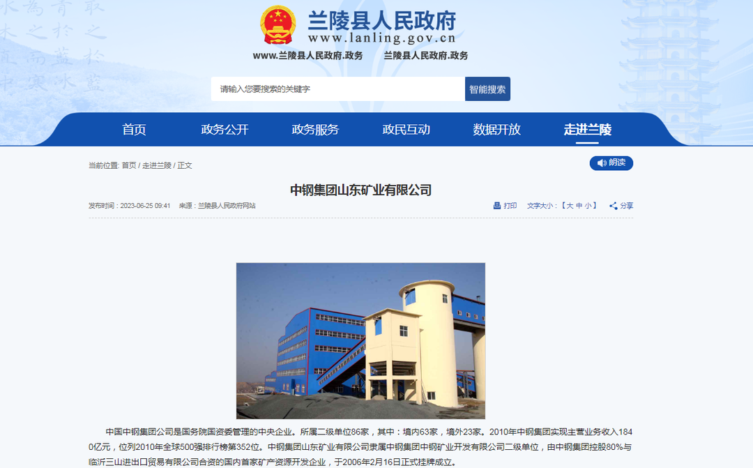 据兰陵县人民政府官网介绍,中国中钢集团公司是国务院国资委管理的中央企业。中钢集团山东矿业隶属中钢集团中钢矿业开发有限公司二级单位,由中钢集团控股80%与临沂三山进出口贸易有限公司合资的国内首家矿产资源开发企业,于2006年2月16日正式挂牌成立。公司保有矿石储量近7916万吨,平均地质品位30.52%,设计规模为年采选原矿200万吨,生产铁精粉60万吨。