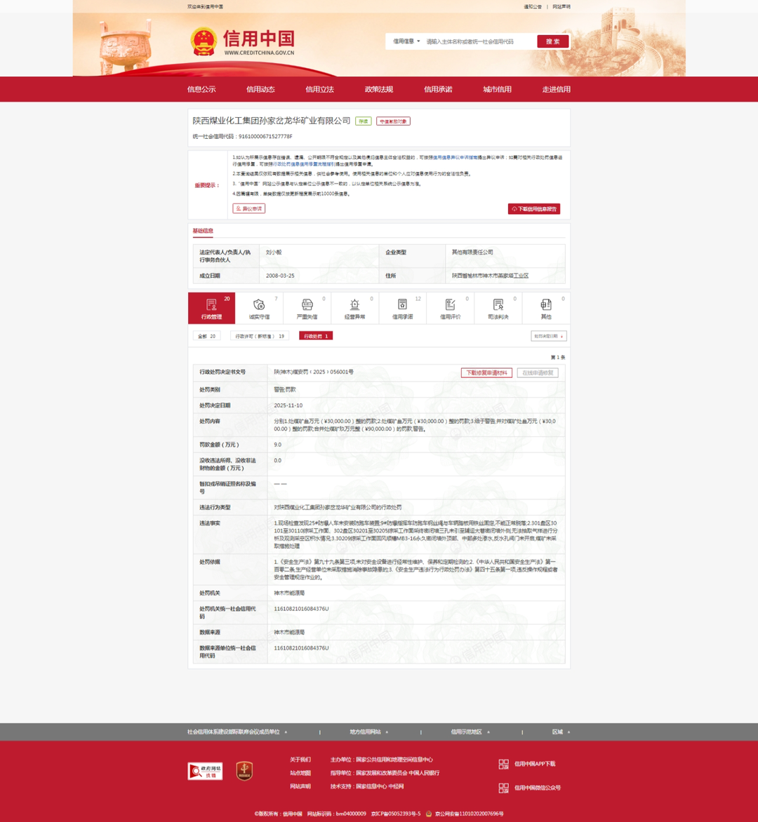 齐鲁晚报·齐鲁壹点记者于信用中国行政处罚信息栏获悉,11月10日,陕西煤业化工集团孙家岔龙华矿业有限公司(下称“陕煤龙华矿业公司”)收到罚单,其处罚类别是“警告;罚款”,处罚机关为神木市能源局。