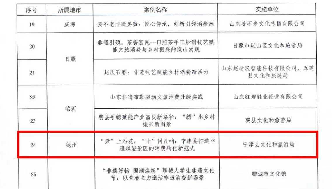 近日,山东省文化和旅游厅公布了2025山东省非遗助力消费推广案例名单,宁津县《“景”上添花,“非”同凡响:宁津县打造非遗赋能景区的消费转化新范式》成功入选。