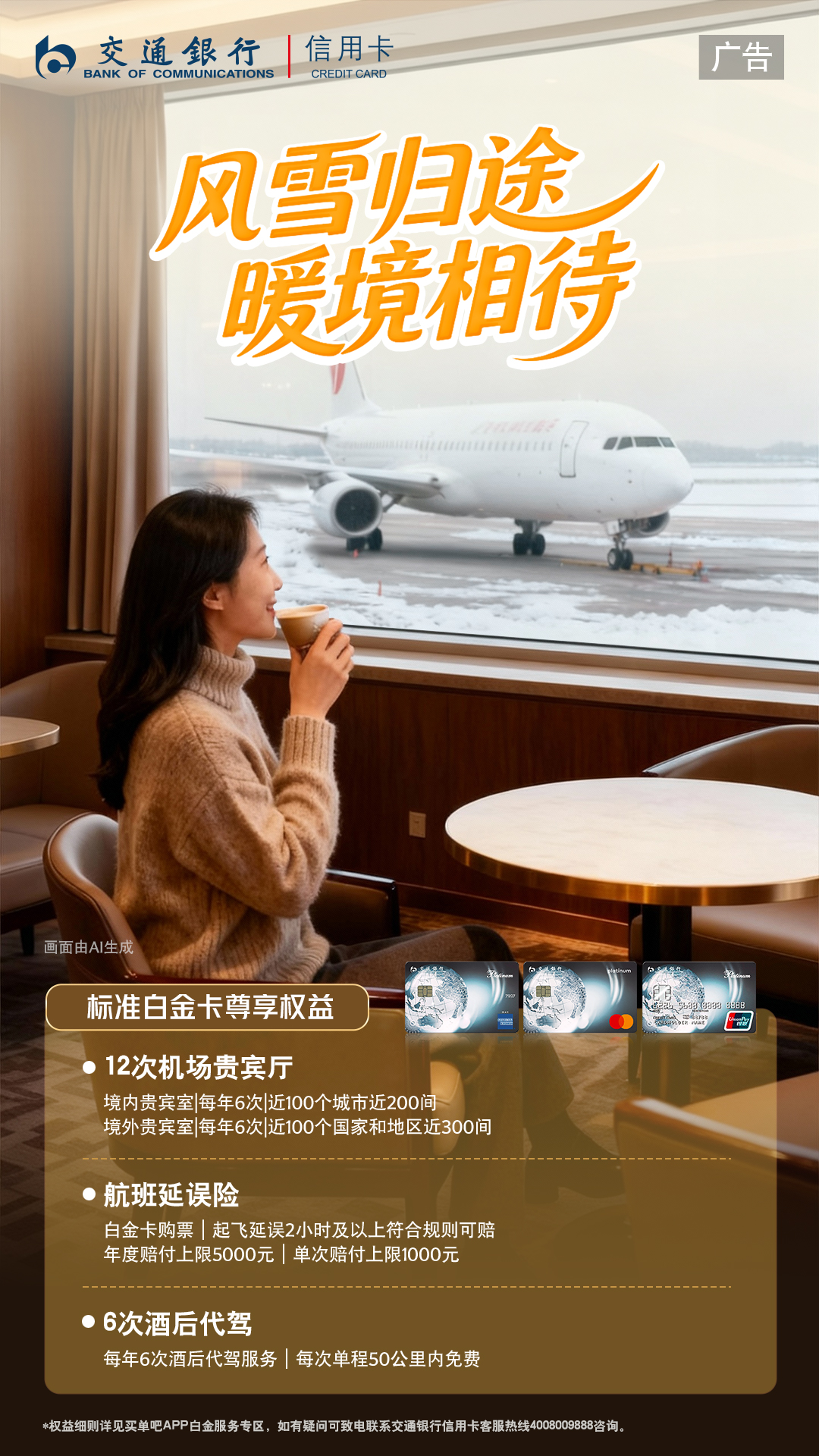 寒潮来袭?别怕!风雪途中有交通银行信用卡给你 “暖 buff” 加持,在奔赴与抵达之间,在匆忙与期待之中,每个转场的间隙,都有温暖如约而至。从贵宾礼遇到延误保障再到安心抵达,交通银行标准白金卡旨在为你打造舒心旅程,让每一次出发与归来,都多一份从容与暖意。