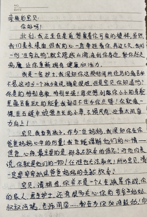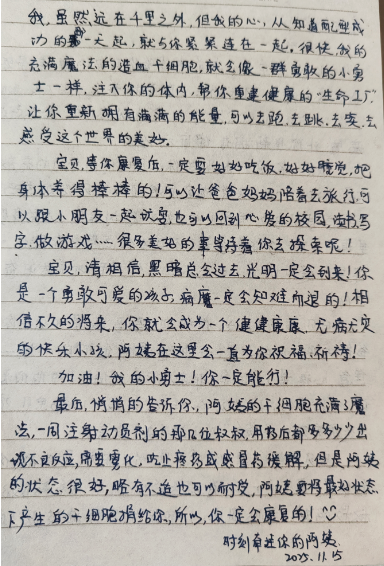 在写给患儿的信中,她充满柔情地写道:“宝贝,阿姨的干细胞充满魔法……叔叔们注射后都出现了不良反应,但阿姨的状态很好,略有不适但也可以耐受。阿姨要将最好状态下产生的干细胞捐给你,你一定会康复的!”