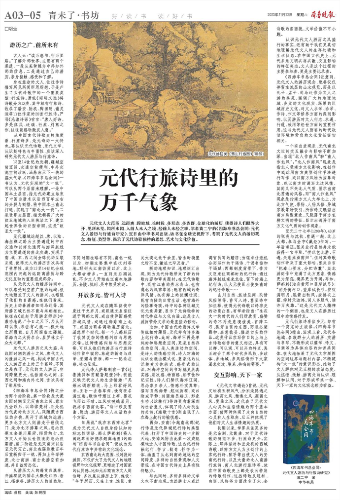 长期以来,学界关注更多的是元杂剧、元散曲,对于元代诗歌的研究不多,行旅诗更少。实际上,耶律楚材和丘处机的西域诗歌,以南方文人为主创作的上京纪行诗,陈孚等出使文人的安南纪行诗,以及大量的北人南游行旅诗、南人北游行旅诗等,放在中国诗歌史上都是极为特别的诗歌创作。这些诗歌从题材、内容、风格等方面改变了宋、金诗歌的旧面貌,文学价值不可小觑。