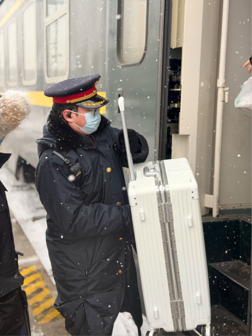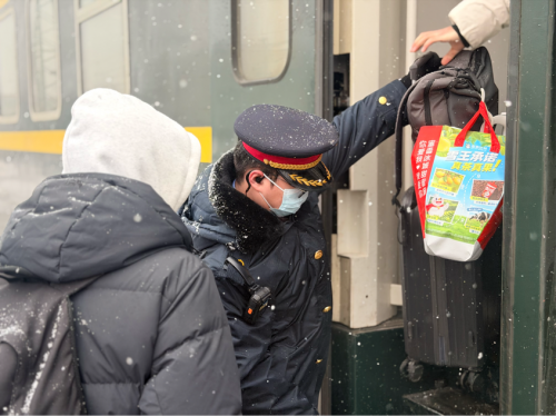 在极端天气下,乘务员始终将安全与服务放在首位,严格执行乘降组织各项措施,并加强对重点旅客的关怀与帮扶。一双双被寒风冻得发红的手,传递的不只是温度,更是一份责任心,他们用切实行动践行了“人民铁路为人民”的初心与承诺。