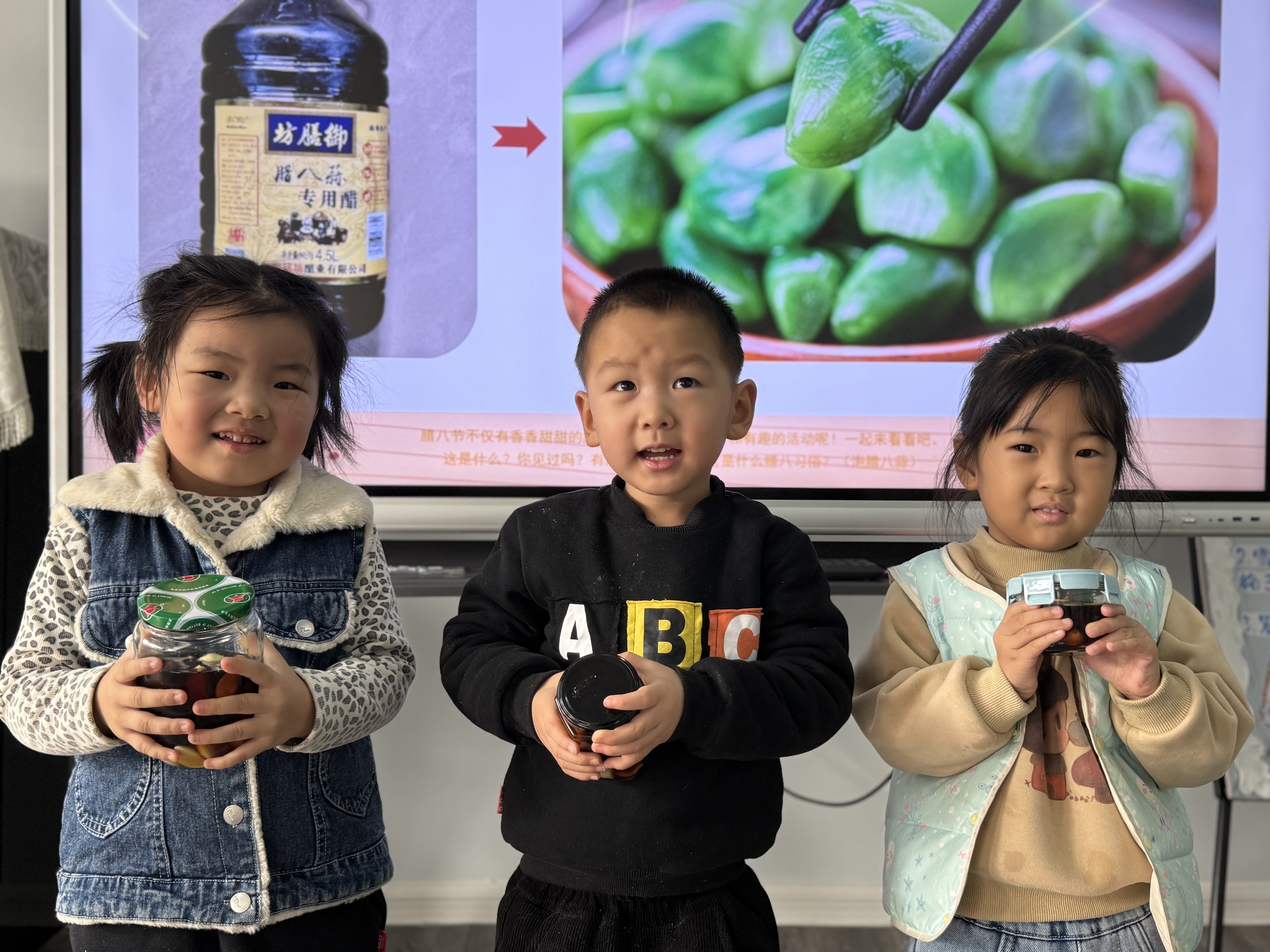 活动伊始,老师们通过趣味绘本、动画短片,向孩子们讲述腊八节的由来,展示红豆、花生、红枣等食材,引导宝贝们摸一摸、闻一闻,在感官探索中认识腊八粥的配料。随后,“小小美食家”们轮番上阵:小心翼翼地剥蒜、装罐、倒醋,期待蒜瓣穿上“绿外衣”;用五彩黏土搓捏“红枣”“桂圆”,为纸碗里的“腊八粥”搭配丰富食材,在动手操作中锻炼精细动作。