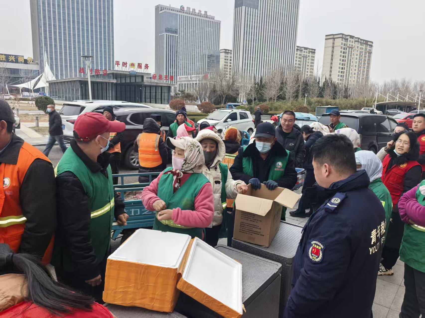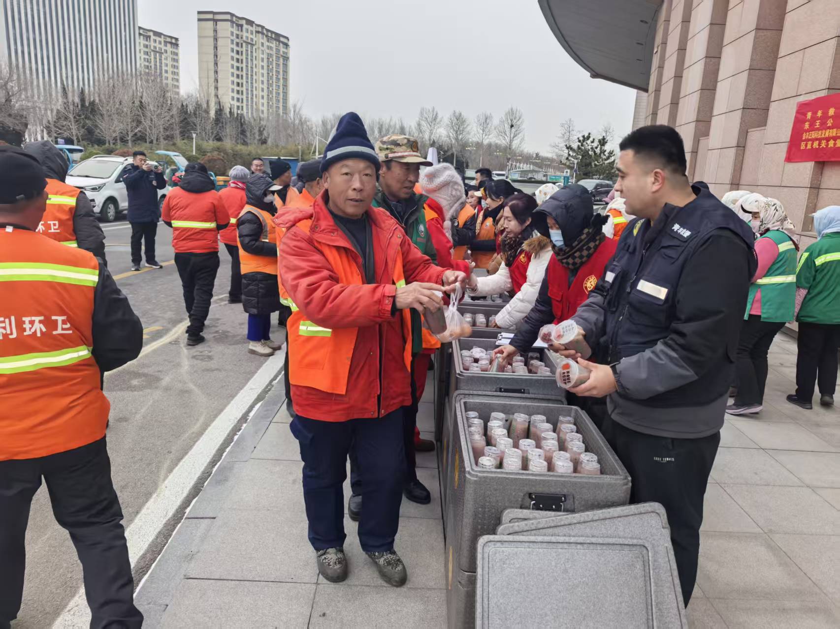 1月24日,活动率先在胜坨镇启动,志愿者们为300名环卫工人送上了精心熬制的腊八粥与蒸鸡蛋,提前送上节日的问候。1月26日腊八节当天,暖心行动在垦利区城区继续开展,800余名环卫工人在岗位上收到了这份暖胃又暖心的节日餐食,让寒冬里的辛勤守护者感受到实实在在的温暖。