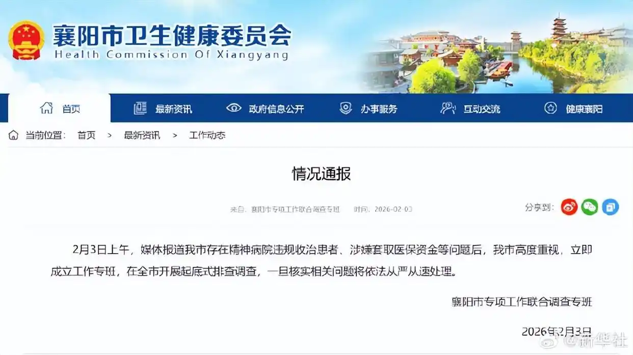 2月3日上午,媒体报道襄阳市存在精神病院违规收治患者、涉嫌套取医保资金等问题后,我市高度重视,立即成立工作专班,在全市开展起底式排查调查,一旦核实相关问题将依法从严从速处理。