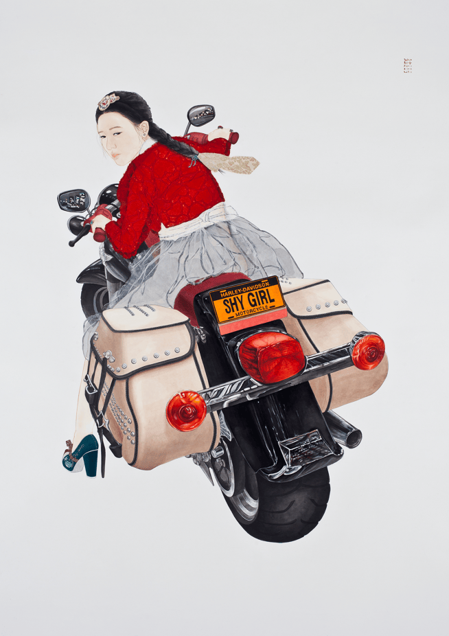 女子的神情,正如题目所写,带着一种“内秀”的意味。她微微侧过头,像是不经意地朝身后瞥去,那目光里同时藏着羞涩、试探、挑衅,以及一丝仿佛怕被人看穿的紧张。可她所骑着的摩托车,却偏偏挂着一块写有“SHY GIRL”的车牌。她一边把自己称作“害羞的女孩”,一边又毫不犹豫地跨坐在一台喧闹、强势、充满男性象征意味的巨大机械之上。正是这种反差,构成了作品最有力量的地方。它带着一点幽默,也带着一点讽刺,轻轻戳破了韩国人身上那种熟悉的姿态:表面端庄克制,内心却始终暗藏着大胆越界的渴望。