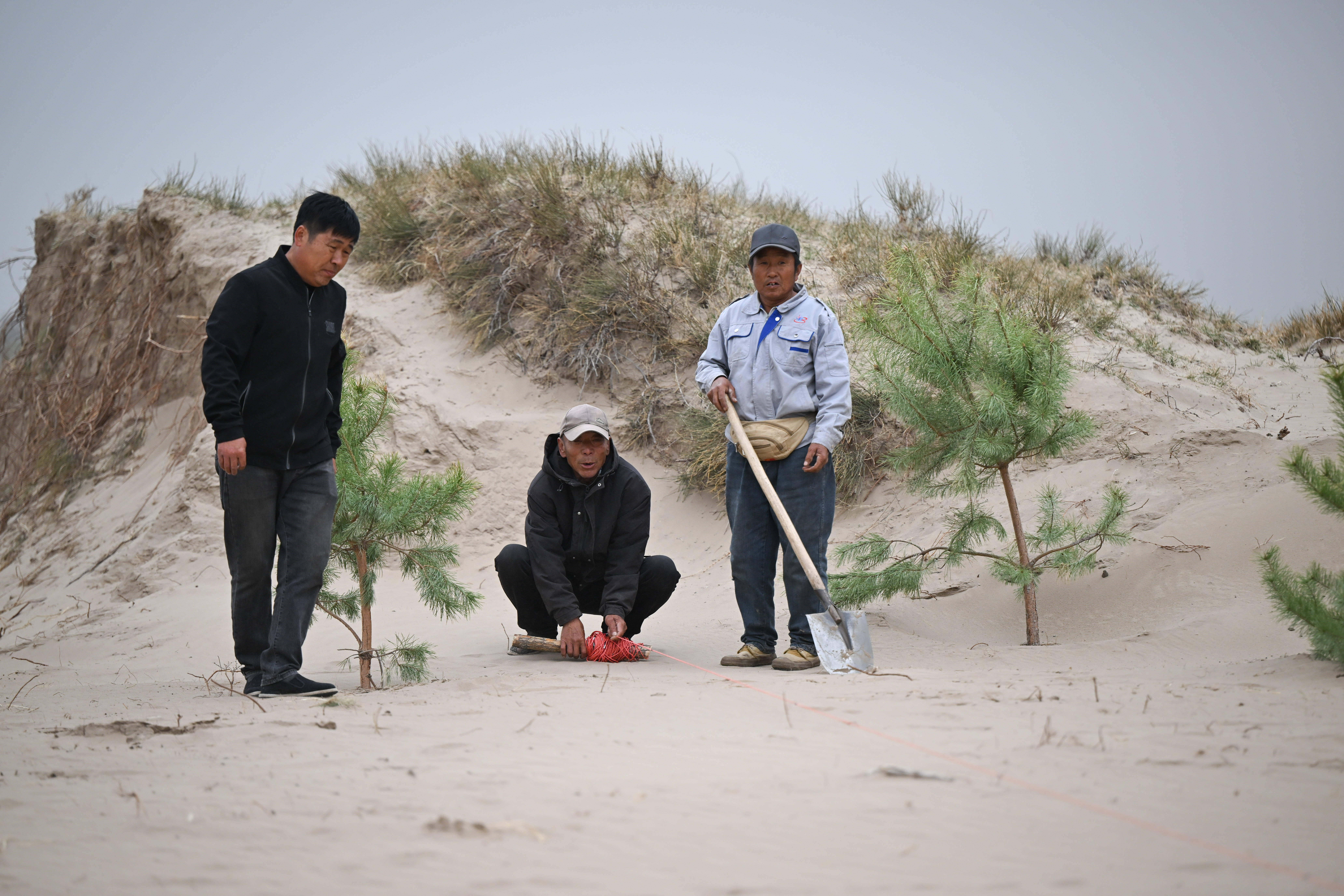 4月19日,治沙工人们在束力古台防沙治沙项目区植树。 新华社记者 连振 摄