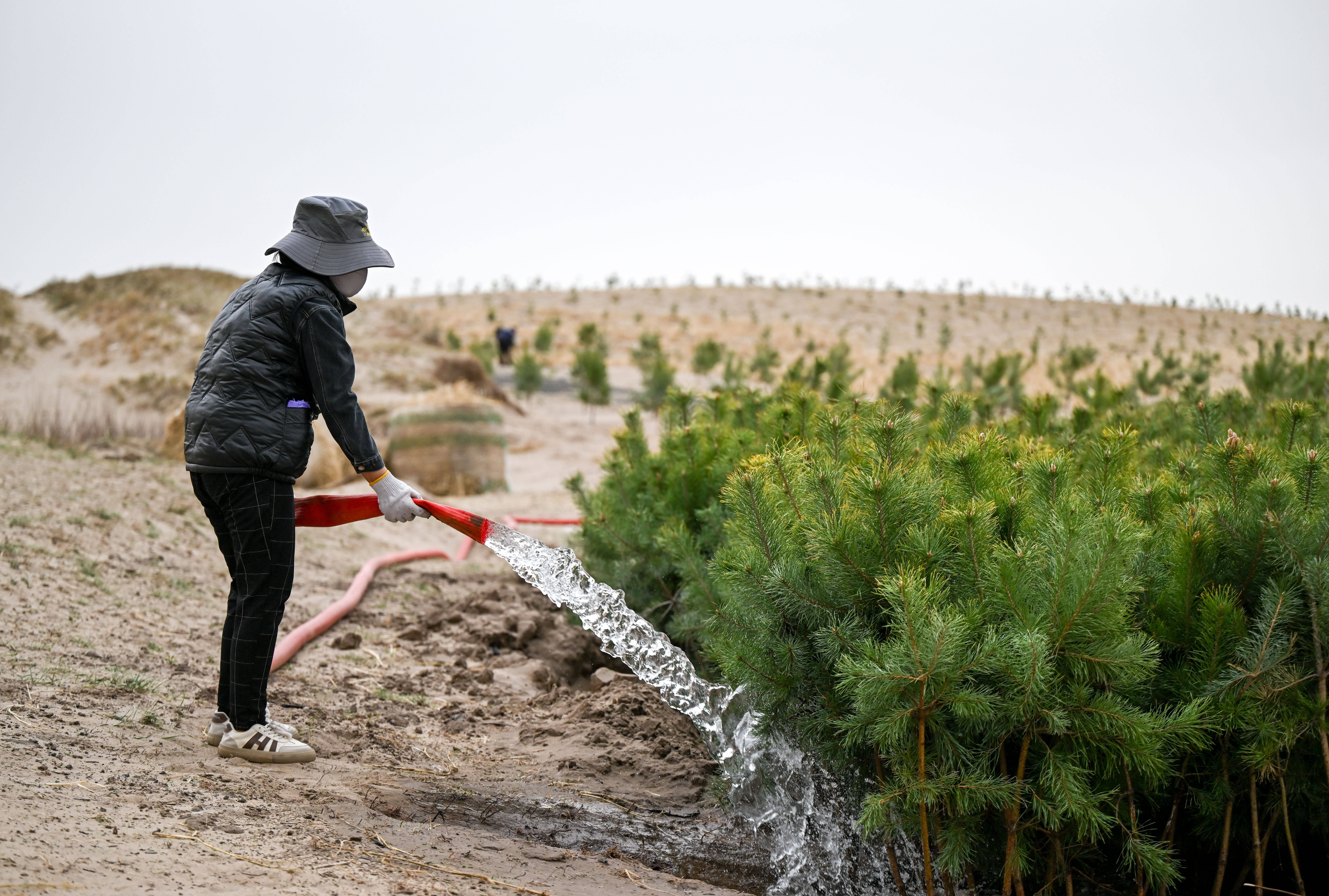 4月19日,治沙工人在束力古台防沙治沙项目区给树苗浇水。 新华社记者 连振 摄