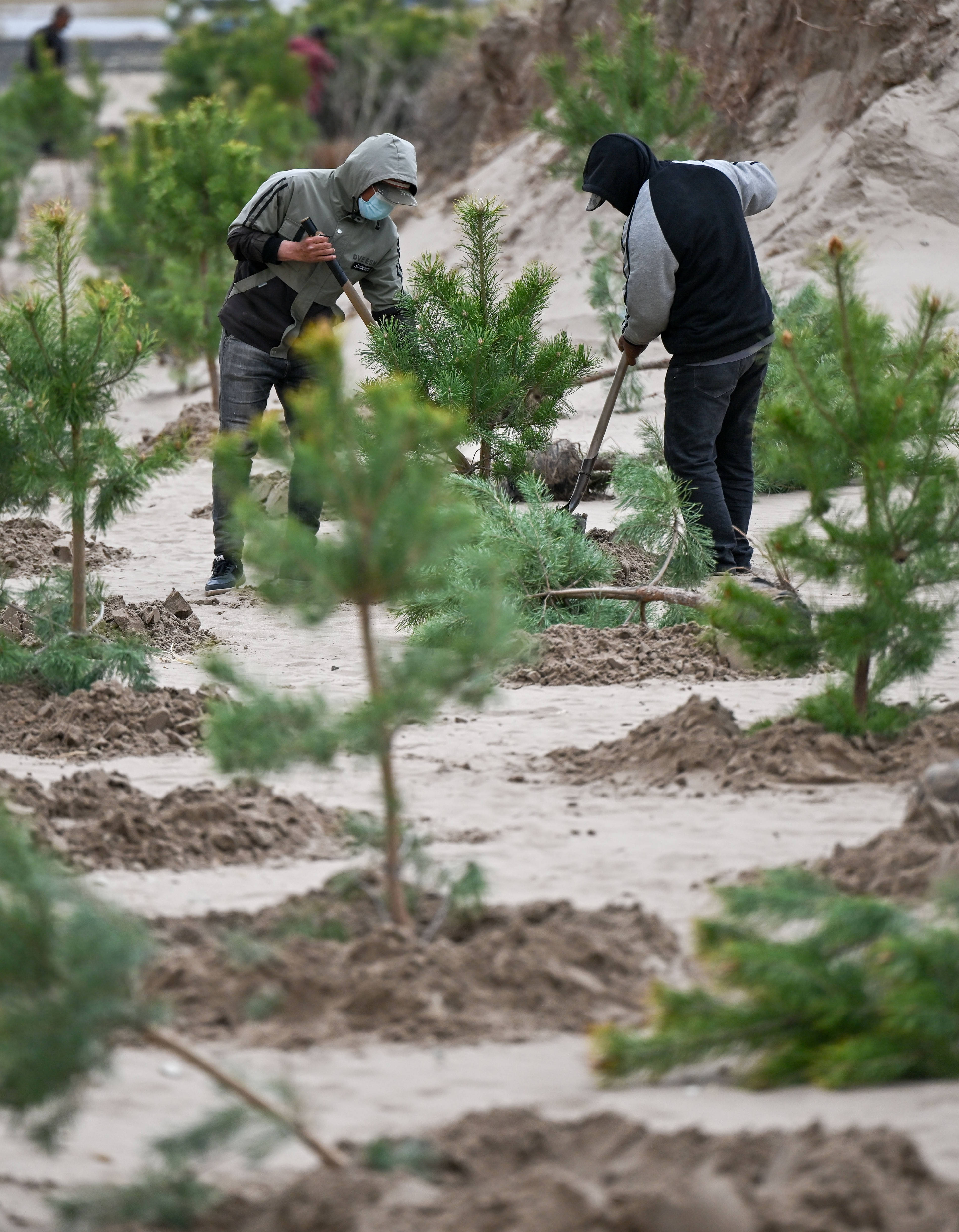 4月19日,治沙工人在束力古台防沙治沙项目区植树。 新华社记者 连振 摄