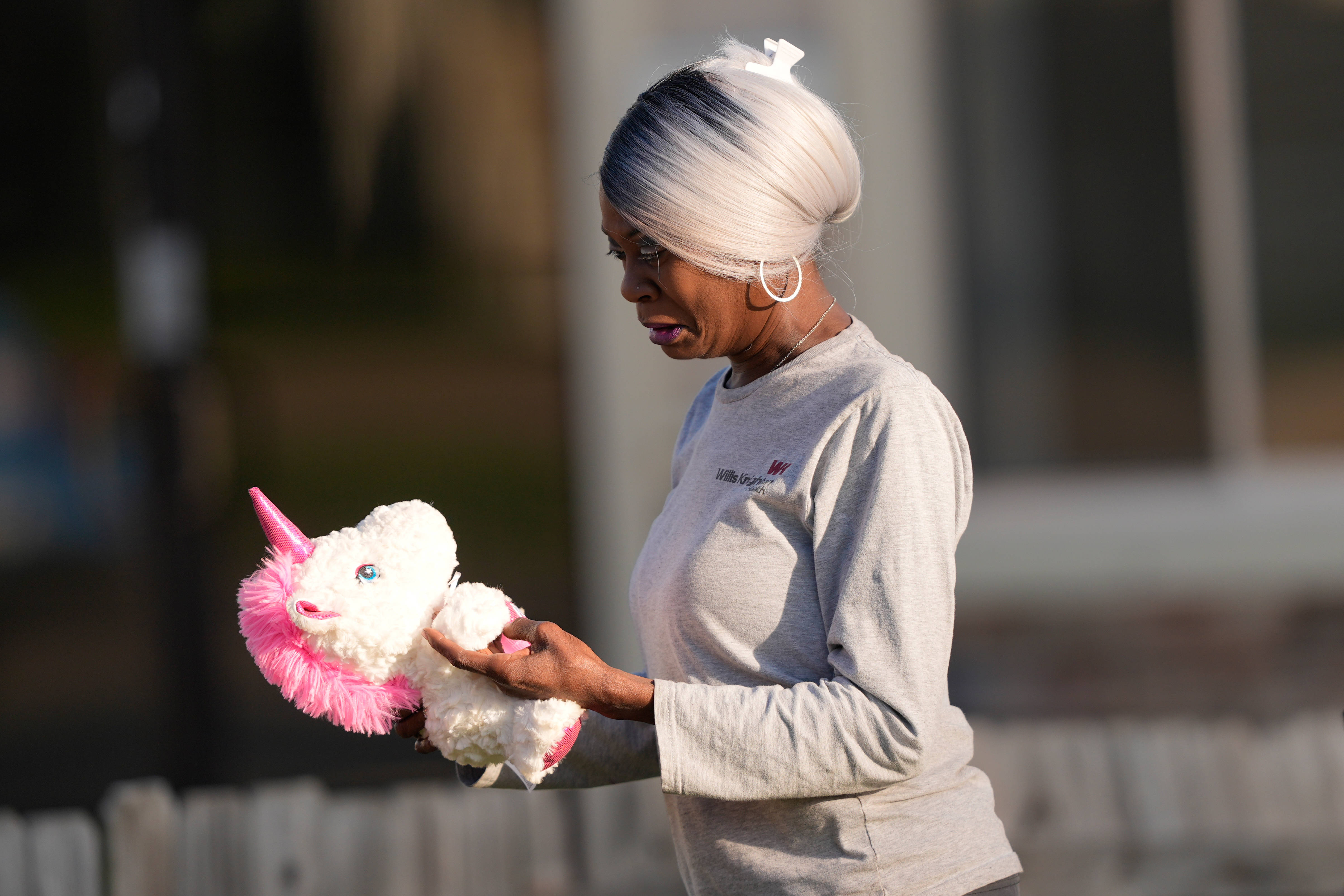 4月19日,在美国路易斯安那州什里夫波特市,一名女子手持玩偶哀悼枪击事件遇难者。 新华社/美联