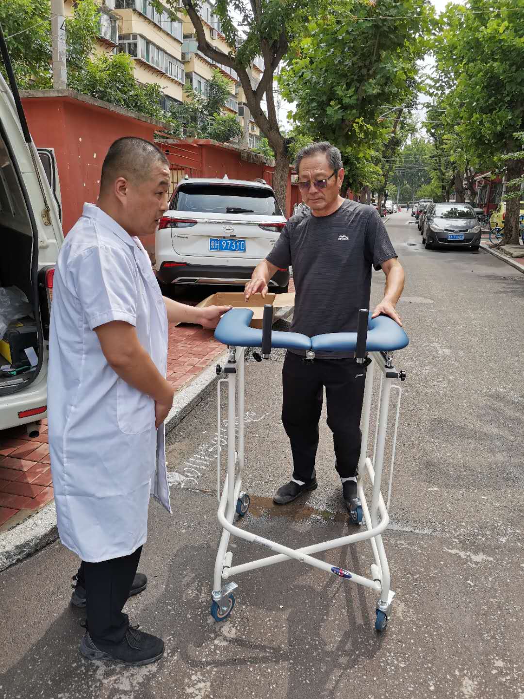 工作人员为残疾人李帅帅适配高位四轮助行器